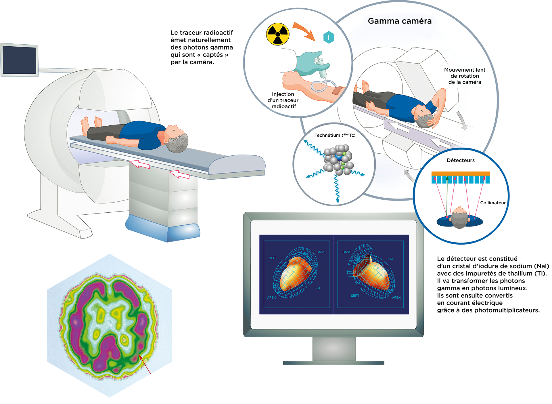 On injecte au patient un produit radioactif, appelé traceur (1). On choisit ce traceur pour qu’il aille se fixer sur l’organe à étudier.