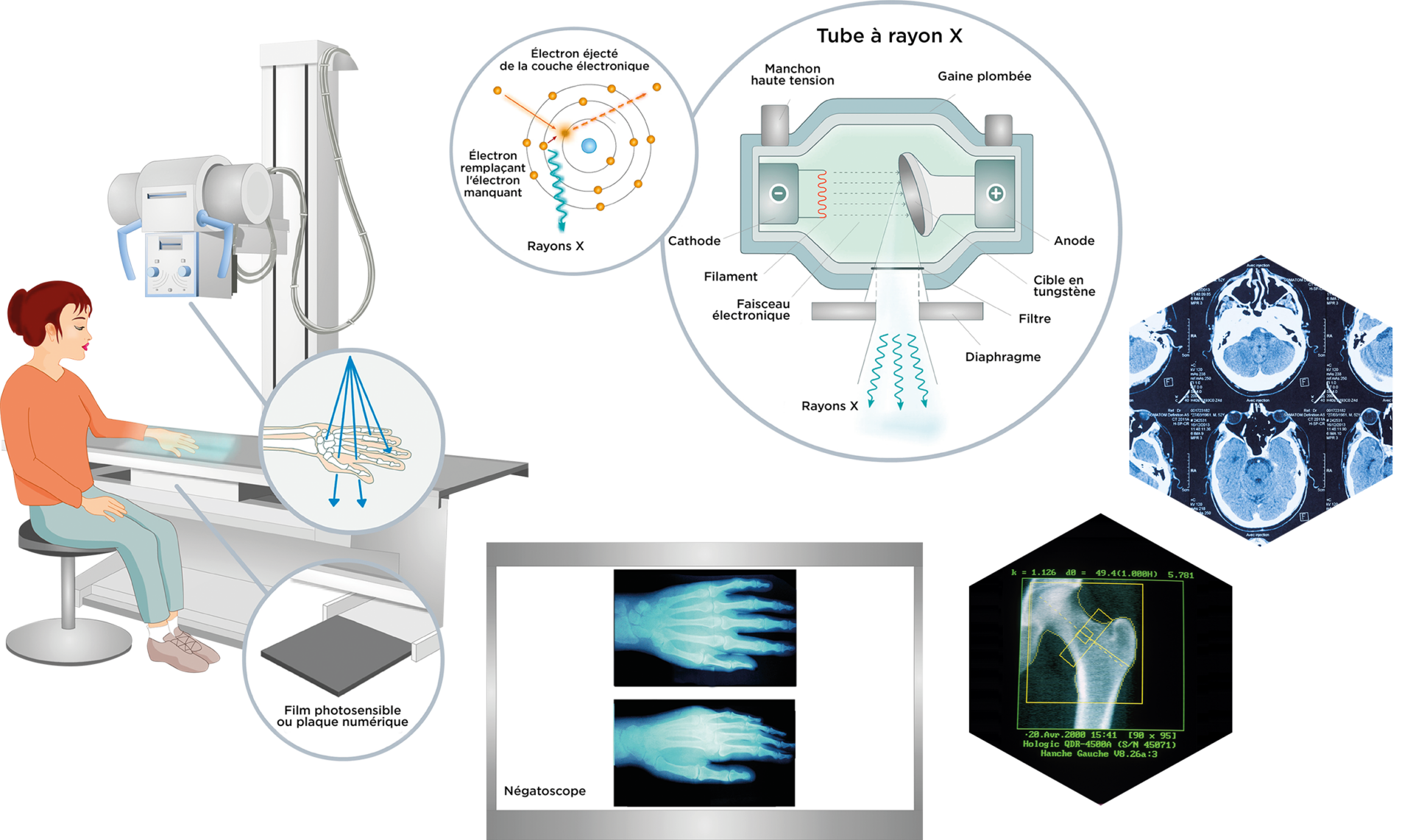 On irradie directement le patient avec des rayons X. En plaçant un détecteur derrière le patient, on peut dresser une carte de l’intérieur de son corps. Plus un tissu est dense, plus il atténue les rayons. Ainsi, les os et les tumeurs apparaissent clairement.