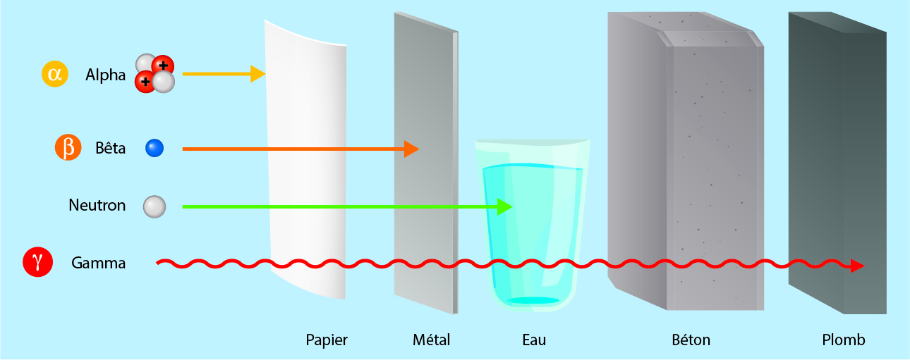 Le rayonnement gamma est très pénétrant et il faut plusieurs centimètres de plomb ou des dizaines de centimètres de béton pour les arrêter. Il est difficile de s’en protéger.