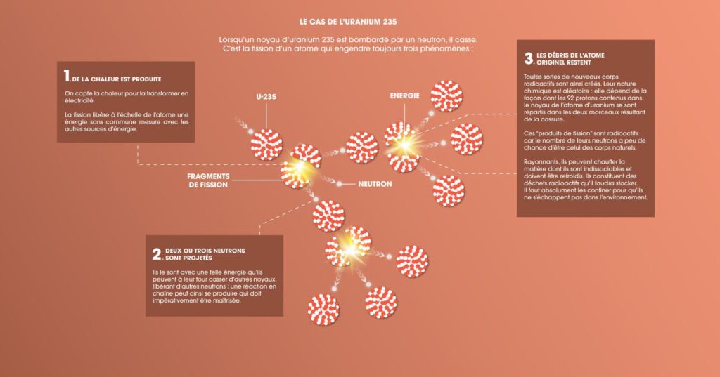 Lorsqu’un noyau d’uranium 235 est bombardé par un neutron, il casse. C’est la fission nucléaire d’un atome qui engendre toujours trois phénomènes :