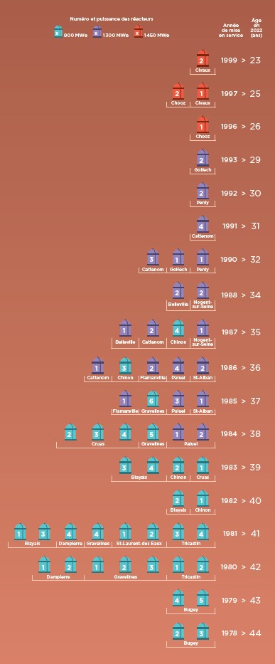 Une majorité de réacteurs français ont été construits entre 1977 et 1984. L’apparition de défauts génériques graves sur des matériels pourrait causer l’arrêt en chaîne de nombreuses