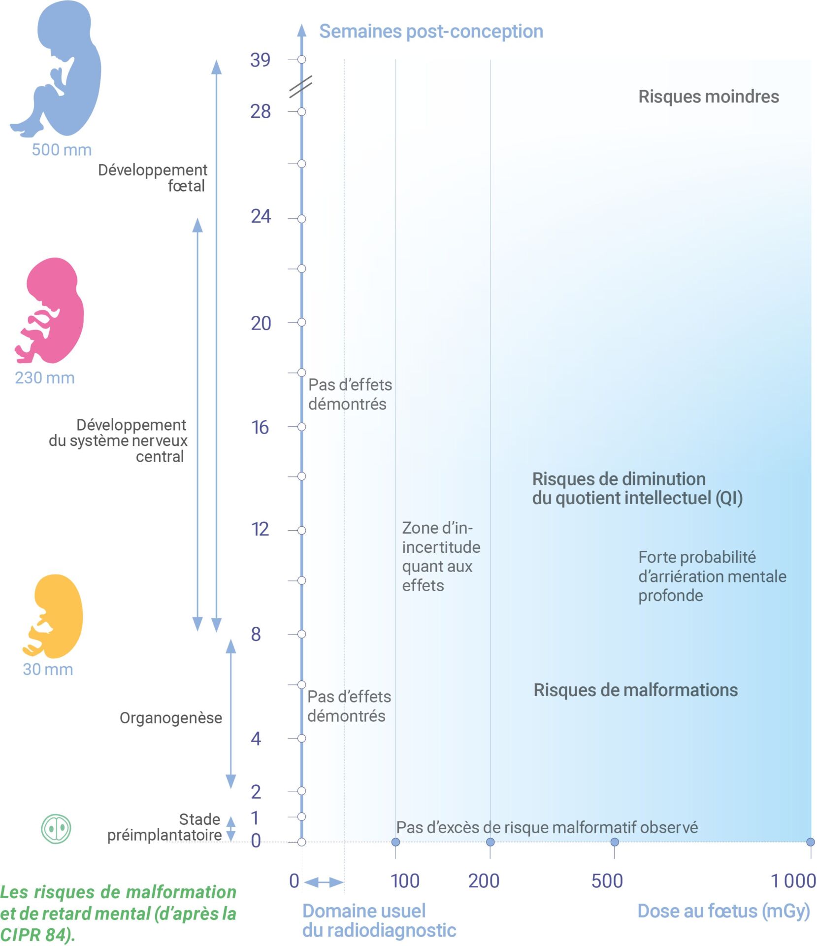 Le développement de l’embryon est tel que les radiations ont un effet « tout ou rien » : l’embryon survit ou pas, mais il n’y a pas de risque de malformation.