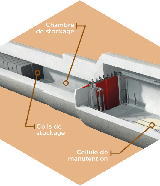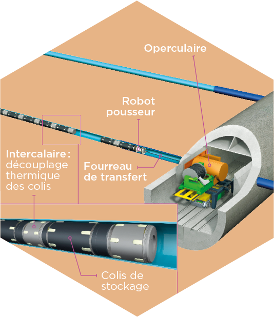 Les colis de déchets de moyenne activité vie longue (MA-VL) seront stockés dans des alvéoles de stockage horizontales de plusieurs centaines de mètres de longueur et d’une dizaine de mètres de diamètre.