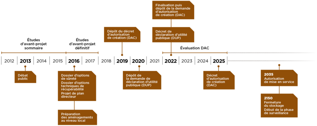 Ces zones de stockage seront développées de façon modulaire sur une durée séculaire pour permettre la construction progressive des alvéoles dans lesquelles seront introduits les colis de déchets. Ces derniers représentent un volume de 85 000 m³. Une fois l’ensemble des colis de déchets stockés, l’installation souterraine sera fermée et les installations de surface démantelées. Une phase de surveillance sur plusieurs centaines d’années sera alors mise en place.
