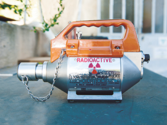 La gammagraphie permet, à l’aide d’un appareil portable contenant une source radioactive, d’apprécier les défauts d’un matériau ou d’une soudure. Cette technique utilise principalement des sources d’iridium 192 et de cobalt 60.