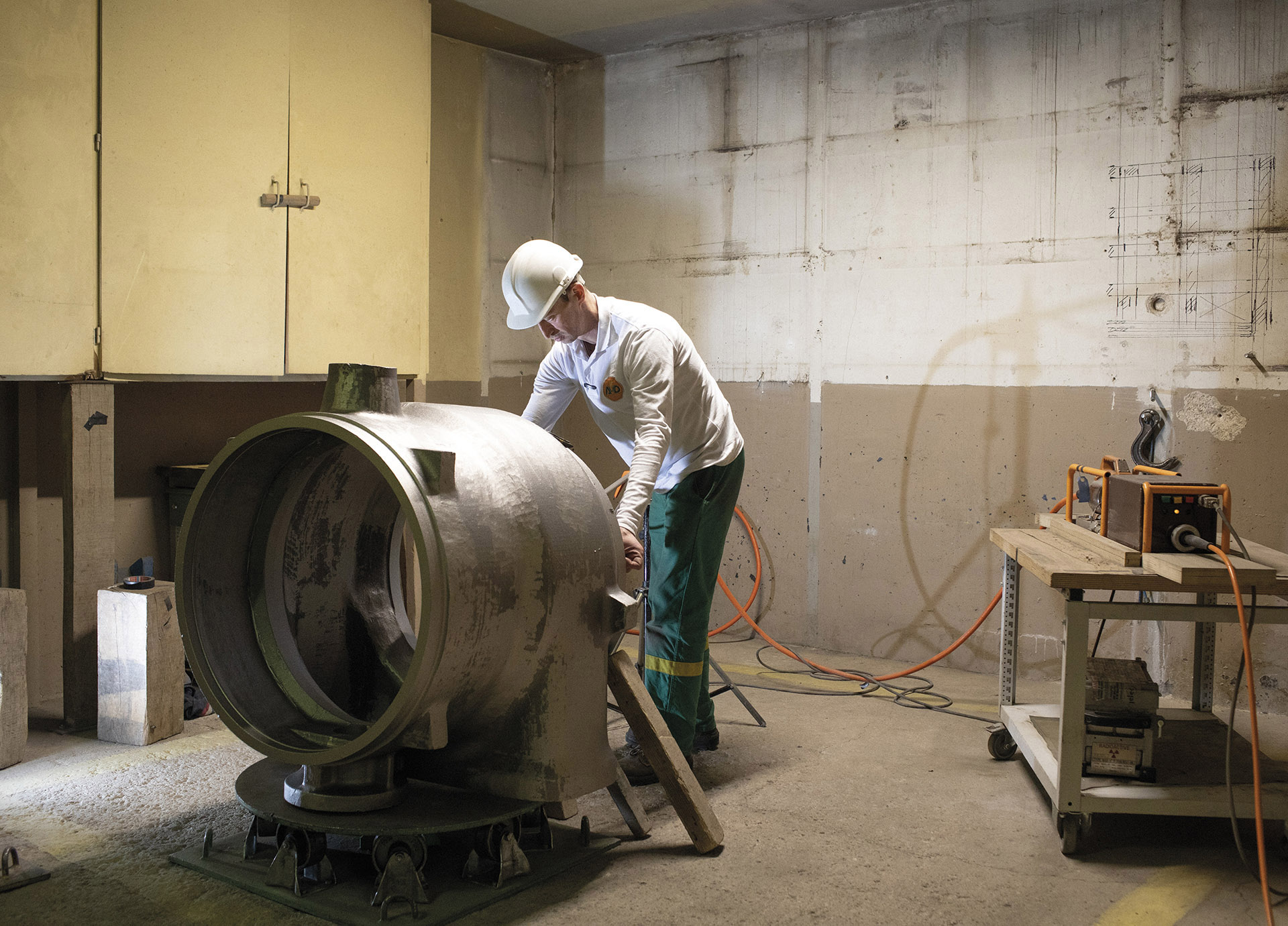 Un technicien prépare un tir de gammagraphie pour inspecter une lourde pièce de chaudronnerie. Ils ont été spécifiquement formés et vont s’éloigner au moment du tir.