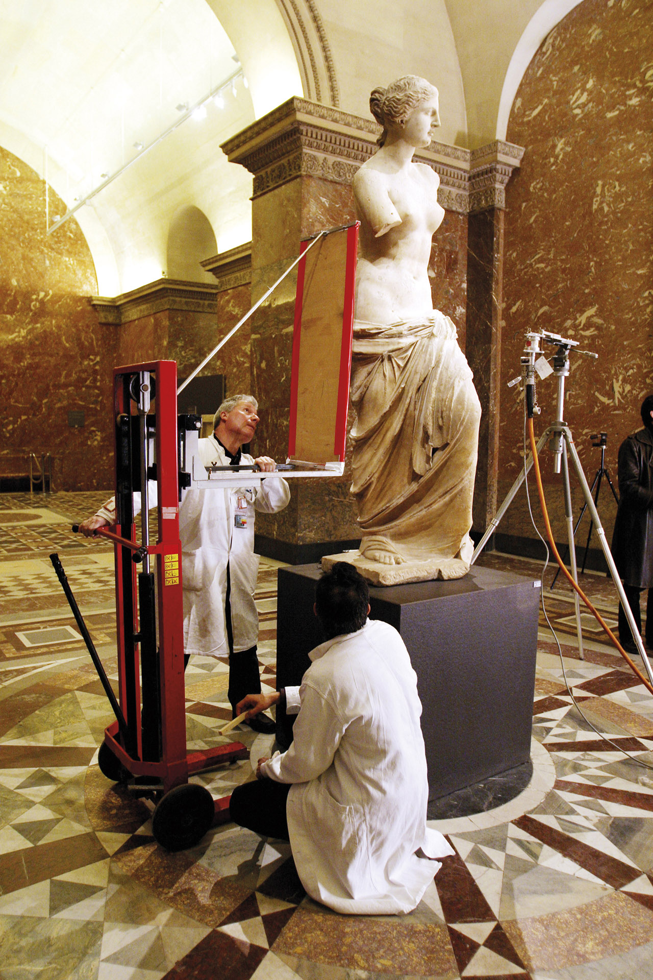 La Vénus de Milo est exposée aux rayons, à l’aide d’un gammagraphe, qui révèleront les fragilités de son anatomie .